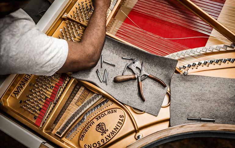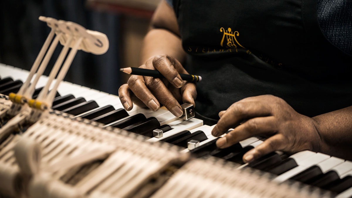 Das Hamburger Werk steht für eine Mischung aus traditioneller Handwerkskunst und moderner Technik. Jeder Flügel entsteht hier in mehr als einem Jahr Arbeit – aus über 12.000 Einzelteilen, wobei das besondere Holz des Resonanzbodens lange Zeit reifen muss, bevor es verarbeitet wird.